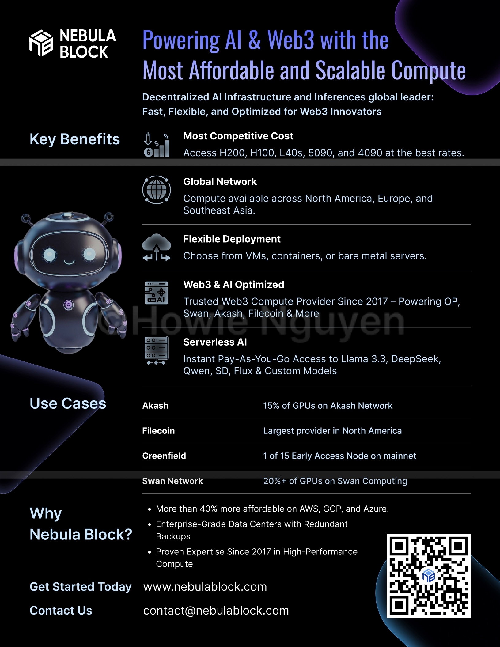 Use Cases (Two Columns with Short Descriptions) • AI Startups – Scale inference and fine-tuning affordably. • Blockchain Projects – Cost-efficient node hosting and DePIN computing. • LLM Inference Providers – High-performance, low-latency solutions. • Enterprises & Research – Reliable, secure, and scalable AI infrastructure.